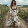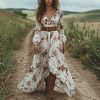 Women's Retro V-neck Floral Long-sleeve Bohemian Pastoral Style Maxi Long Dress