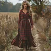 Women's Vintage V-neck Bohemian Pastoral Plaid Style Long-sleeve Maxi Long Dress